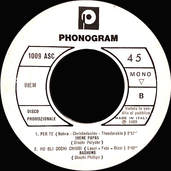 (Francesco Banti) Lato B: PER TE (Irene Papas) / HO GLI OCCHI CHIUSI (Bashung) |