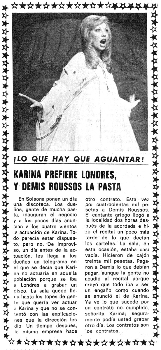 | Karina prefiere Londres, y Demis Roussos la pasta |